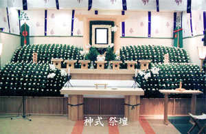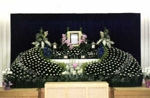伝統的な白木祭壇に清楚で落ち着いた雰囲気を醸し出すため、お花で古墳をイメージしてみました。